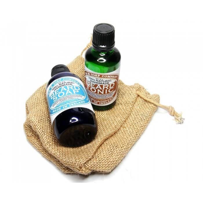 Il Kit Deluxe per la cura della barba comprende i famosi prodotti naturali fatti a mano di Dr K: il sapone e il lussuoso tonico per la barba confezionati in un sacchetto regalo in iuta.