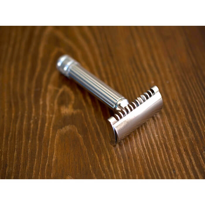 Il Chrome Classic è un rasoio di sicurezza in 3 pezzi contraddistinto dal classico disegno del manico a colonna ionica che si interrompe con l’elegante base zigrinata che facilita l’apertura a vite della testina.